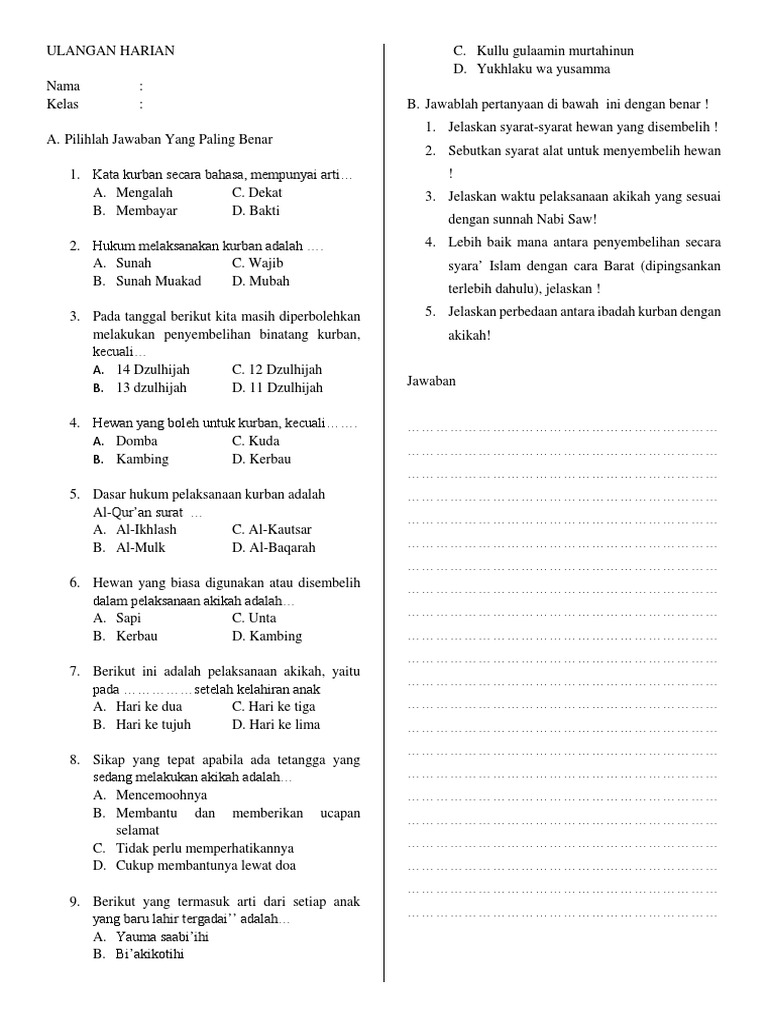 Bagaimanakah hukum mengonsumsi daging hewan hasil berburu? (soal paibp kelas 9 smp/mts bab akikah dan qurban).para pembaca sekolahmuonline, berikut ini kami sajikan kembali contoh soal paibp kelas 9 smp dan mts bab pembahasan akikah dan qurban. Apabila hewan sembelihan akikah dimaksud adalah untuk akikah yang sudah lewat dari 7 hari kelahiran bayi atau untuk mengakikahi orang dewasa, alangkah baiknya jika disarankan untuk dialihkan niatnya sebagai hewan kurban. Alat menyembelih harus tajam dan tidak boleh menggunakan kuku, gigi, atau tulang d. 10 kuliner khas aceh july 17, 2021.